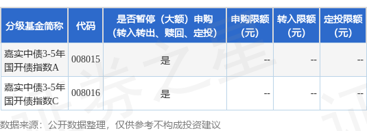 证券之星消息,1月22日嘉实基金管理有限公司发布《关于嘉实中债3-5年国开行债券指数证券投资基金2025年春节前暂停申购(含转换转入)业务的公告》。公告中提示,为了保证基金的平稳运作,保护基金份额持有人利益,自2025年1月24日起嘉实中债3-5年国开行债券指数证券投资基金2025年春节前暂停申购(含转换转入)业务,下属分级基金调整明细如下:
