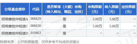 证券之星消息,1月22日招商基金管理有限公司发布《关于调整招商鑫悦中短债债券型证券投资基金A类份额、C类份额大额申购(含定期定额投资)和转换转入业务并暂停D类份额申购(含定期定额投资)和转换转入业务的公告》。公告中提示,为保障基金的平稳运作,维护基金份额持有人利益,自2025年1月24日起调整招商鑫悦中短债债券型证券投资基金A类份额、C类份额大额申购(含定期定额投资)和转换转入业务并暂停D类份额申购(含定期定额投资)和转换转入业务,申购、转换转入上限金额为5.0万元,下属分级基金调整明细如下: