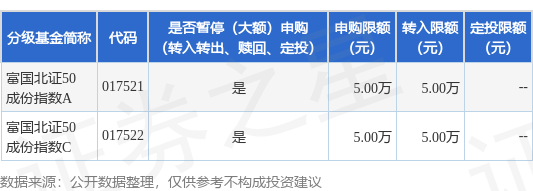 证券之星消息,1月22日富国基金管理有限公司发布《关于富国北证50成份指数型证券投资基金暂停大额申购、转换转入及定期定额投资业务的公告》。公告中提示,为了保证基金的平稳运作,保护基金持有人的利益,自2025年1月22日起富国北证50成份指数型证券投资基金暂停大额申购、转换转入及定期定额投资业务,下属分级基金调整明细如下: