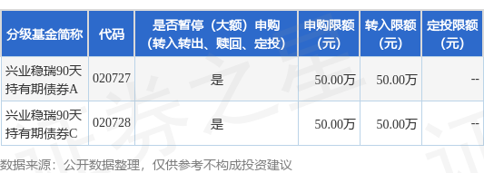 证券之星消息,1月22日兴业基金管理有限公司发布《兴业稳瑞90天持有期债券型证券投资基金2025年春节前暂停大额申购(含转换转入和定期定额投资)公告》。公告中提示,为了保证基金的平稳运作,保护现有基金份额持有人利益,自2025年1月23日起兴业稳瑞90天持有期债券型证券投资基金2025年春节前暂停大额申购(含转换转入和定期定额投资),申购、转换转入上限金额为50.0万元,下属分级基金调整明细如下: