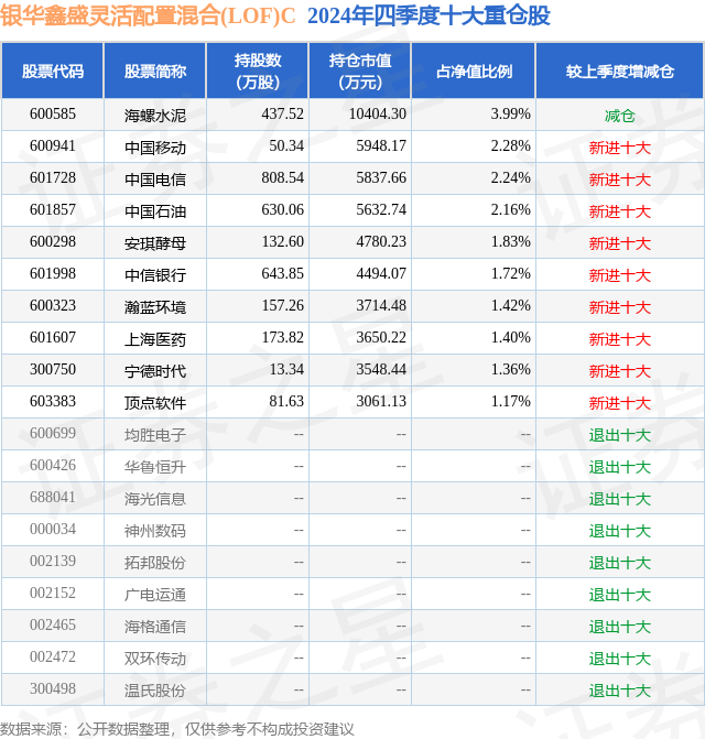 从基金规模来看,银华鑫盛灵活配置混合(LOF)C基金2024年四季度公布的基金规模为5.27亿元,较上一期规模5.06亿元变化了2061.67万元,环比变化了4.07%。该基金最新一期资产配置为:股票占净值比83.82%,无债券类资产,现金占净值比19.13%。从基金持仓来看,该基金当季前十大股票仓位达19.57%,第一大重仓股为海螺水泥(600585),持仓占比为3.99%。