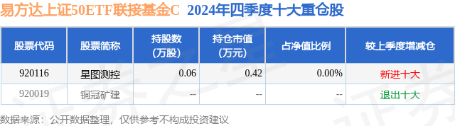 从基金规模来看,易方达上证50ETF联接基金C基金2024年四季度公布的基金规模为6.19亿元,较上一期规模4.97亿元变化了1.22亿元,环比变化了24.49%。该基金最新一期资产配置为:无股票类资产,无债券类资产,现金占净值比5.56%。从基金持仓来看,该基金当季前十大股票仓位达0.0%,第一大重仓股为星图测控(920116),持仓占比为0.0%。