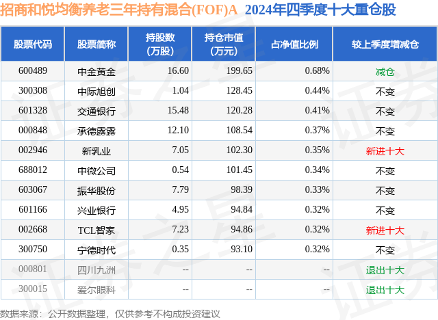 从基金规模来看,招商和悦均衡养老三年持有混合(FOF)A基金2024年四季度公布的基金规模为2.36亿元,较上一期规模2.49亿元变化了-1268.45万元,环比变化了-5.1%。该基金最新一期资产配置为:股票占净值比14.77%,债券占净值比5.24%,现金占净值比1.11%。从基金持仓来看,该基金当季前十大股票仓位达3.88%,第一大重仓股为中金黄金(600489),持仓占比为0.68%。