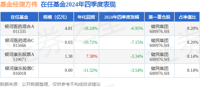 证券之星消息,日前银河医药混合C基金公布四季报,2024年四季度最新规模0.03亿元,季度净值涨幅为-7.15%。
