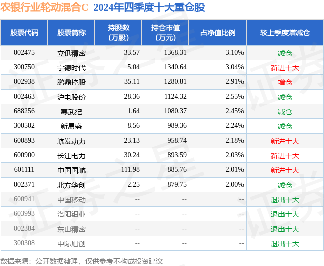从基金规模来看,农银行业轮动混合C基金2024年四季度公布的基金规模为0.05亿元,较上一期规模600.6万元变化了-78.35万元,环比变化了-13.05%。该基金最新一期资产配置为:股票占净值比86.4%,无债券类资产,现金占净值比14.28%。从基金持仓来看,该基金当季前十大股票仓位达24.51%,第一大重仓股为立讯精密(002475),持仓占比为3.1%。