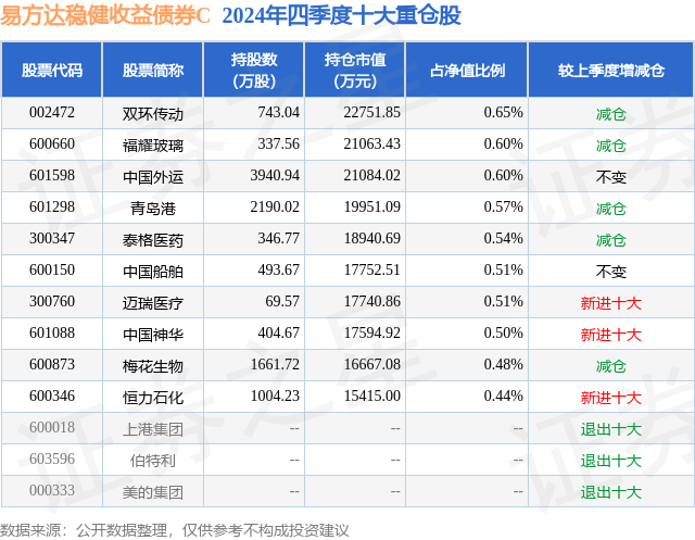 从基金规模来看,易方达稳健收益债券C基金2024年四季度公布的基金规模为1.53亿元,较上一期规模1.2亿元变化了3285.64万元,环比变化了27.42%。该基金最新一期资产配置为:股票占净值比13.98%,债券占净值比111.96%,现金占净值比0.11%。从基金持仓来看,该基金当季前十大股票仓位达5.4%,第一大重仓股为双环传动(002472),持仓占比为0.65%。