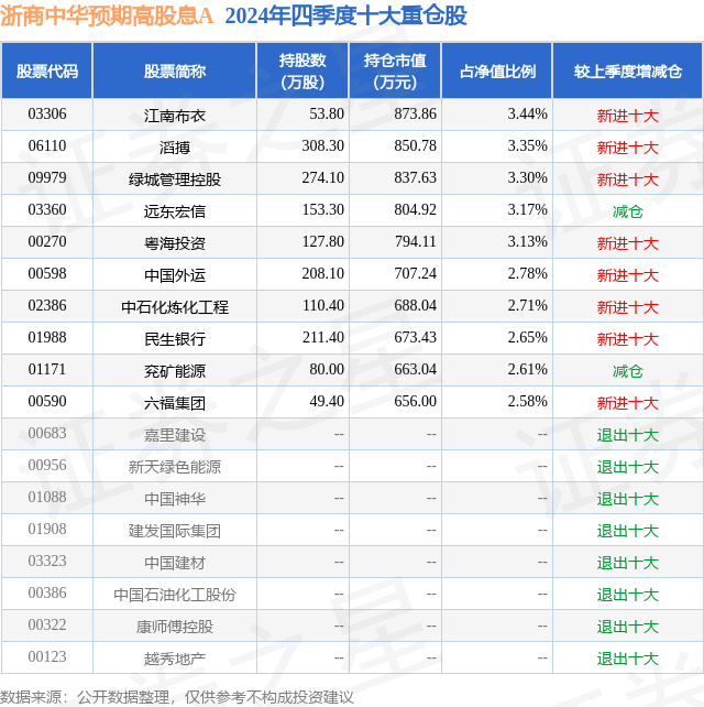 证券之星消息,日前浙商中华预期高股息A基金公布四季报,2024年四季度最新规模1.56亿元,季度净值涨幅为-2.03%。