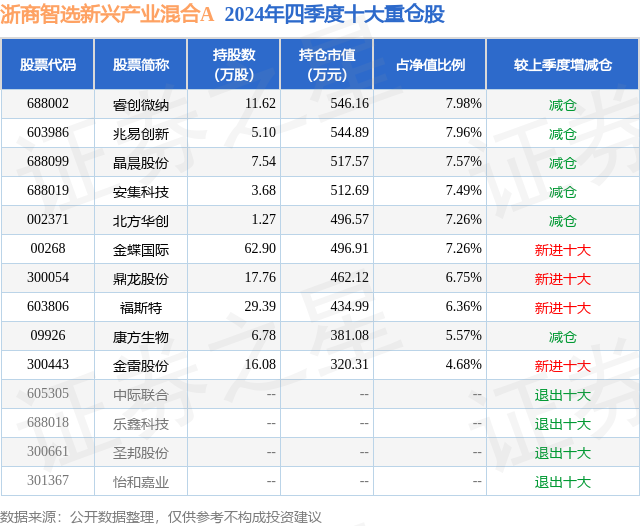 从基金规模来看,浙商智选新兴产业混合A基金2024年四季度公布的基金规模为0.41亿元,较上一期规模1.03亿元变化了-6219.54万元,环比变化了-60.39%。该基金最新一期资产配置为:股票占净值比91.34%,无债券类资产,现金占净值比10.13%。从基金持仓来看,该基金当季前十大股票仓位达68.88%,第一大重仓股为睿创微纳(688002),持仓占比为7.98%。
