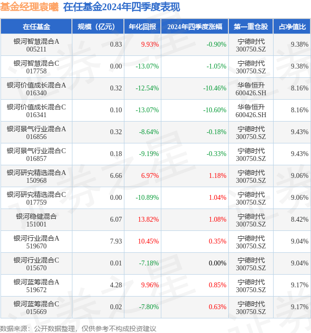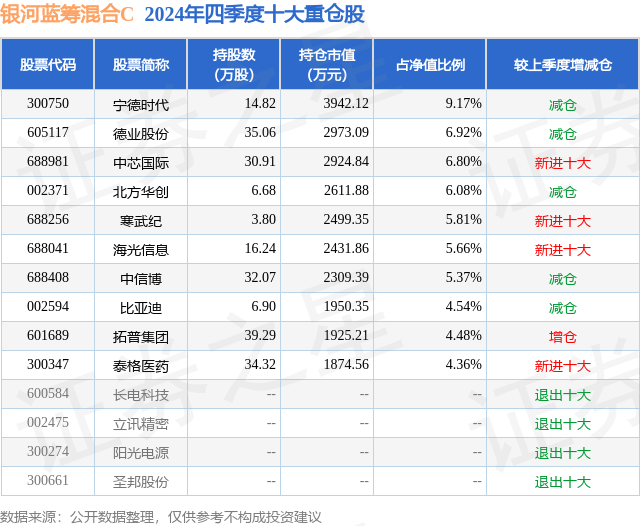 从基金规模来看,银河蓝筹混合C基金2024年四季度公布的基金规模为0.02亿元,较上一期规模149.55万元变化了26.75万元,环比变化了17.88%。该基金最新一期资产配置为:股票占净值比93.97%,无债券类资产,现金占净值比6.4%。从基金持仓来看,该基金当季前十大股票仓位达59.19%,第一大重仓股为宁德时代(300750),持仓占比为9.17%。