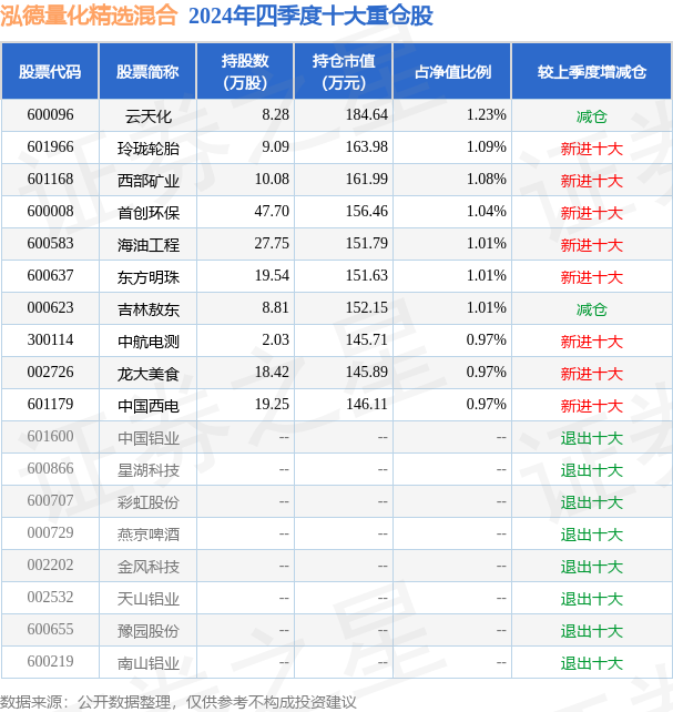 从基金规模来看,泓德量化精选混合基金2024年四季度公布的基金规模为1.5亿元,较上一期规模1.75亿元变化了-2442.68万元,环比变化了-13.96%。该基金最新一期资产配置为:股票占净值比94.3%,无债券类资产,现金占净值比5.84%。从基金持仓来看,该基金当季前十大股票仓位达10.38%,第一大重仓股为云天化(600096),持仓占比为1.23%。