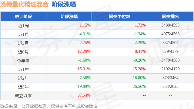 从业绩表现来看,泓德量化精选混合基金过去一年净值涨幅为15.31%,在同类基金中排名2102/4120,同类基金过去一年净值涨幅中位数为15.28%。而基金过去一年的最大回撤为-15.22%,成立以来的最大回撤为-51.51%。
