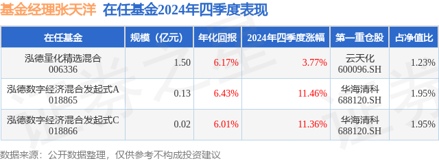 证券之星消息,日前泓德量化精选混合基金公布四季报,2024年四季度最新规模1.5亿元,季度净值涨幅为3.77%。