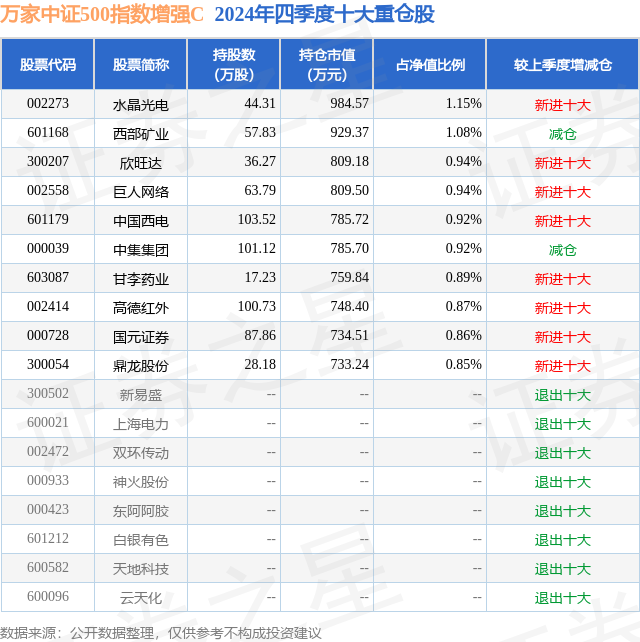 从基金规模来看,万家中证500指数增强C基金2024年四季度公布的基金规模为2.55亿元,较上一期规模5.47亿元变化了-2.93亿元,环比变化了-53.44%。该基金最新一期资产配置为:股票占净值比94.32%,无债券类资产,现金占净值比6.36%。从基金持仓来看,该基金当季前十大股票仓位达9.42%,第一大重仓股为水晶光电(002273),持仓占比为1.15%。