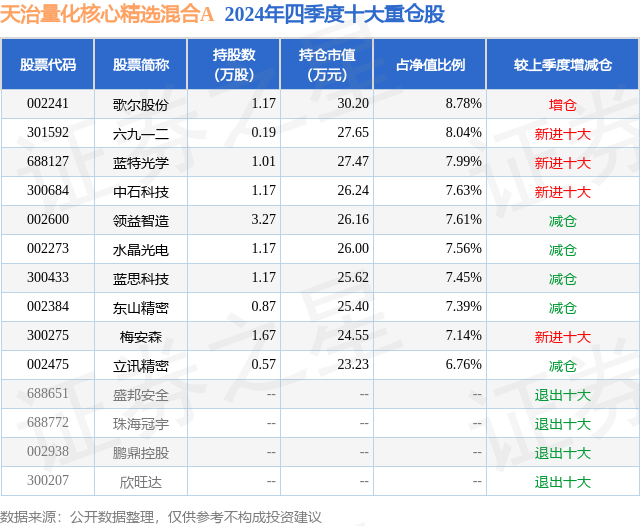 从基金规模来看,天治量化核心精选混合A基金2024年四季度公布的基金规模为0.01亿元,较上一期规模53.4万元变化了6.86万元,环比变化了12.84%。该基金最新一期资产配置为:股票占净值比91.41%,无债券类资产,现金占净值比9.6%。从基金持仓来看,该基金当季前十大股票仓位达76.35%,第一大重仓股为歌尔股份(002241),持仓占比为8.78%。
