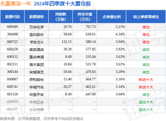 从基金规模来看,永赢惠泽一年基金2024年四季度公布的基金规模为1.47亿元,较上一期规模1.5亿元变化了-283.76万元,环比变化了-1.89%。该基金最新一期资产配置为:股票占净值比94.73%,无债券类资产,现金占净值比0.48%。从基金持仓来看,该基金当季前十大股票仓位达37.19%,第一大重仓股为万华化学(600309),持仓占比为5.21%。