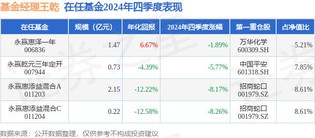 永赢惠泽一年现任基金经理为王乾。其中在任基金经理王乾已从业0年又215天,2024年6月21日正式接手管理永赢惠泽一年,任职期间累计回报为10.03%。目前还管理着4只基金产品(包括A类和C类)。