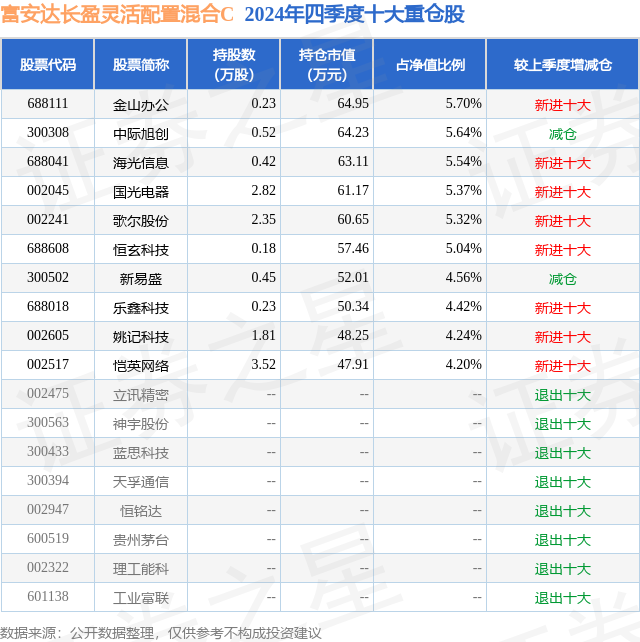 从基金规模来看,富安达长盈灵活配置混合C基金2024年四季度公布的基金规模为0.1亿元,较上一期规模1053.44万元变化了-101.66万元,环比变化了-9.65%。该基金最新一期资产配置为:股票占净值比90.84%,无债券类资产,现金占净值比9.31%。从基金持仓来看,该基金当季前十大股票仓位达50.03%,第一大重仓股为金山办公(688111),持仓占比为5.7%。