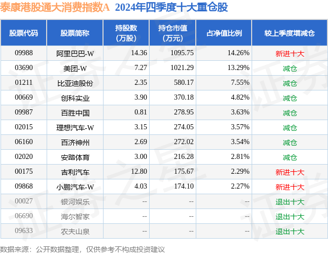 从基金规模来看,泰康港股通大消费指数A基金2024年四季度公布的基金规模为0.34亿元,较上一期规模3983.24万元变化了-549.74万元,环比变化了-13.8%。该基金最新一期资产配置为:股票占净值比94.24%,债券占净值比0.93%,现金占净值比5.08%。从基金持仓来看,该基金当季前十大股票仓位达58.03%,第一大重仓股为阿里巴巴-W(09988),持仓占比为14.26%。