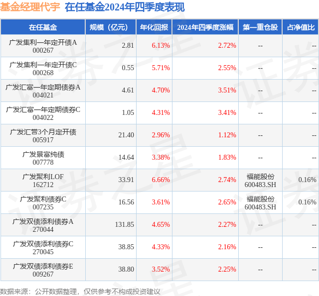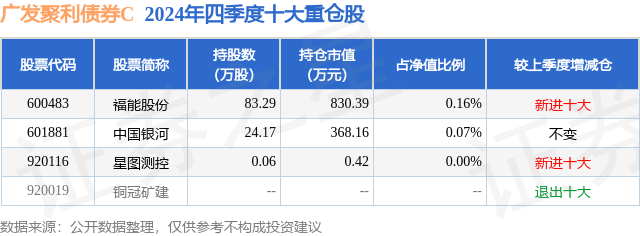 证券之星消息,日前广发聚利债券C基金公布四季报,2024年四季度最新规模16.56亿元,季度净值涨幅为2.65%。