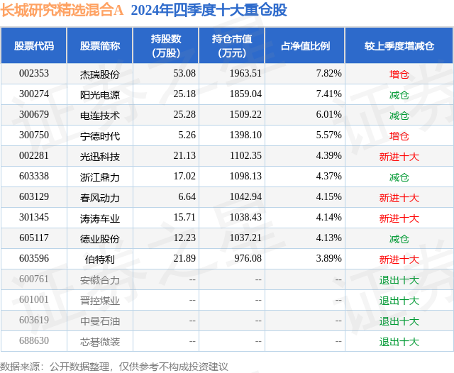 证券之星消息,日前长城研究精选混合A基金公布四季报,2024年四季度最新规模2.51亿元,季度净值涨幅为-4.64%。