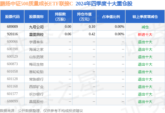 证券之星消息,日前鹏扬中证500质量成长ETF联接C基金公布四季报,2024年四季度最新规模2.09亿元,季度净值涨幅为-4.55%。