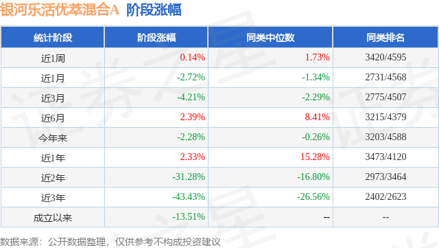 从业绩表现来看,银河乐活优萃混合A基金过去一年净值涨幅为2.33%,在同类基金中排名3473/4120,同类基金过去一年净值涨幅中位数为15.28%。而基金过去一年的最大回撤为-25.08%,成立以来的最大回撤为-65.92%。