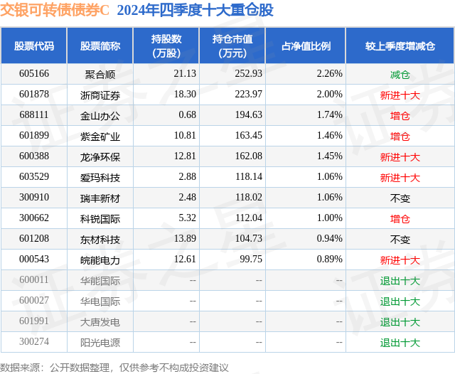 从基金规模来看,交银可转债债券C基金2024年四季度公布的基金规模为0.22亿元,较上一期规模2085.33万元变化了97.93万元,环比变化了4.7%。该基金最新一期资产配置为:股票占净值比33.7%,债券占净值比85.64%,现金占净值比1.67%。从基金持仓来看,该基金当季前十大股票仓位达13.86%,第一大重仓股为聚合顺(605166),持仓占比为2.26%。