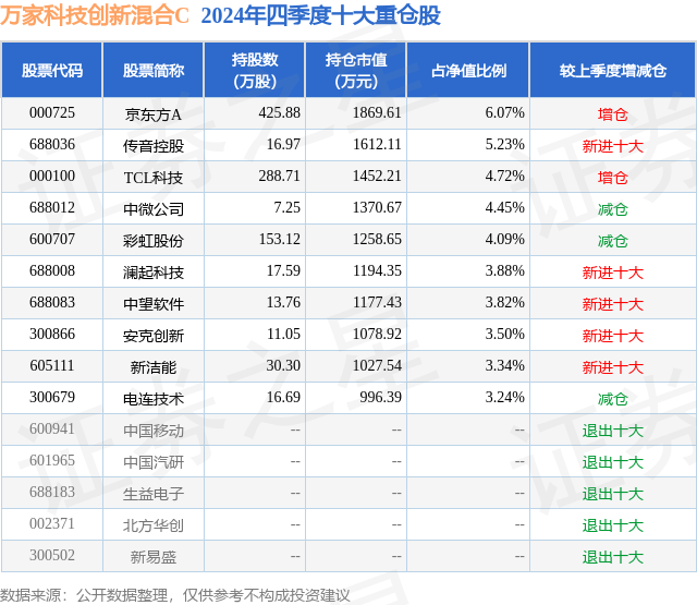 从基金规模来看,万家科技创新混合C基金2024年四季度公布的基金规模为1.4亿元,较上一期规模1.95亿元变化了-5487.28万元,环比变化了-28.16%。该基金最新一期资产配置为:股票占净值比83.5%,债券占净值比1.22%,现金占净值比16.92%。从基金持仓来看,该基金当季前十大股票仓位达42.34%,第一大重仓股为京东方A(000725),持仓占比为6.07%。