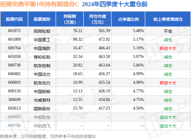 证券之星消息,日前招商安鼎平衡1年持有期混合C基金公布四季报,2024年四季度最新规模0.26亿元,季度净值涨幅为-2.89%。
