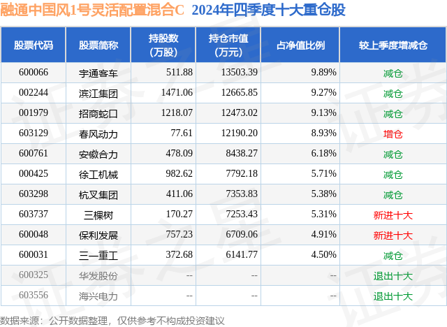 从基金规模来看,融通中国风1号灵活配置混合C基金2024年四季度公布的基金规模为0.08亿元,较上一期规模902.4万元变化了-148.98万元,环比变化了-16.51%。该基金最新一期资产配置为:股票占净值比92.47%,无债券类资产,现金占净值比8.7%。从基金持仓来看,该基金当季前十大股票仓位达69.21%,第一大重仓股为宇通客车(600066),持仓占比为9.89%。