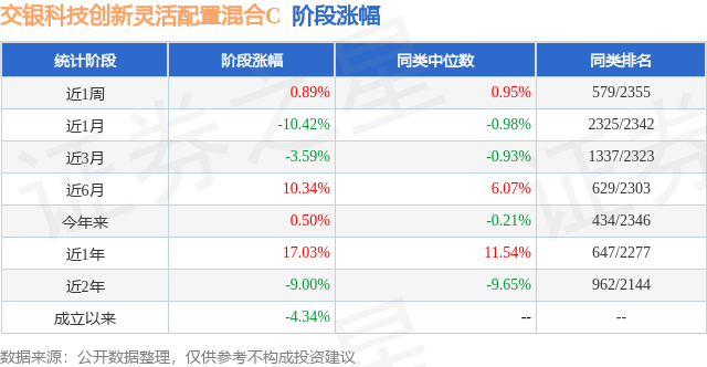从业绩表现来看,交银科技创新灵活配置混合C基金过去一年净值涨幅为17.03%,在同类基金中排名647/2277,同类基金过去一年净值涨幅中位数为11.54%。而基金过去一年的最大回撤为-20.52%,成立以来的最大回撤为-35.59%。