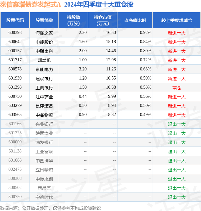 从基金规模来看,泰信鑫瑞债券发起式A基金2024年四季度公布的基金规模为0.09亿元,较上一期规模931.77万元变化了18.17万元,环比变化了1.95%。该基金最新一期资产配置为:股票占净值比10.13%,债券占净值比80.86%,现金占净值比9.15%。从基金持仓来看,该基金当季前十大股票仓位达6.63%,第一大重仓股为海澜之家(600398),持仓占比为0.92%。
