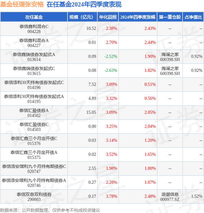 证券之星消息,日前泰信鑫瑞债券发起式C基金公布四季报,2024年四季度最新规模0.08亿元,季度净值涨幅为1.82%。
