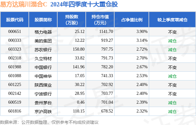 证券之星消息,日前易方达瑞川混合C基金公布四季报,2024年四季度最新规模0.24亿元,季度净值涨幅为1.54%。