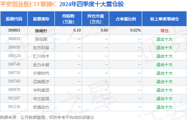 从基金规模来看,平安创业板ETF联接C基金2024年四季度公布的基金规模为2.58亿元,较上一期规模2.07亿元变化了5144.79万元,环比变化了24.9%。该基金最新一期资产配置为:股票占净值比0.02%,债券占净值比0.63%,现金占净值比5.04%。从基金持仓来看,该基金当季前十大股票仓位达0.02%,第一大重仓股为指南针(300803),持仓占比为0.02%。