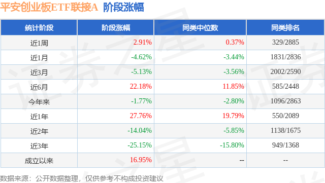 从业绩表现来看,平安创业板ETF联接A基金过去一年净值涨幅为27.76%,在同类基金中排名550/2089,同类基金过去一年净值涨幅中位数为19.79%。而基金过去一年的最大回撤为-20.12%,成立以来的最大回撤为-52.51%。