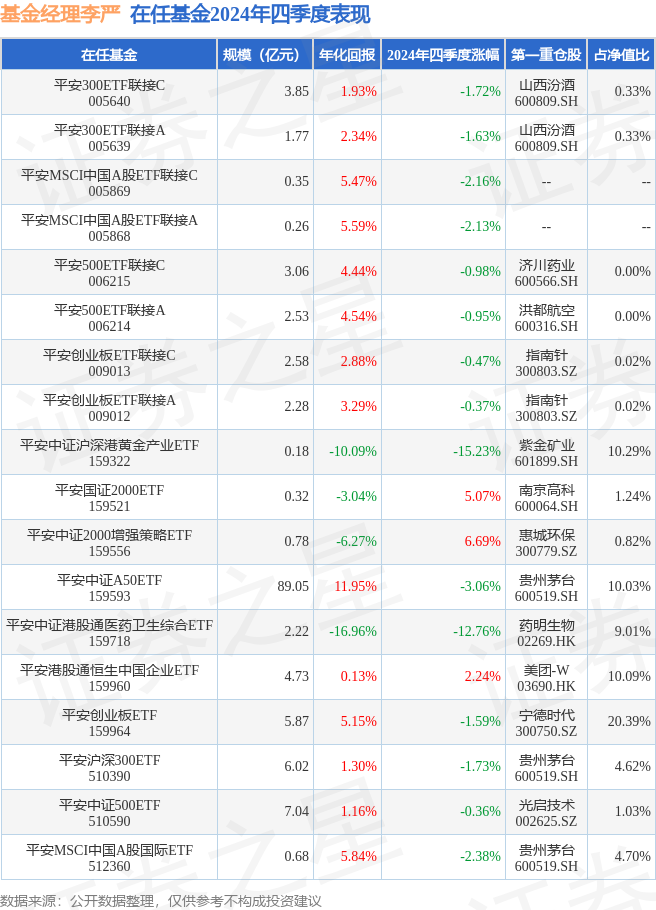 从基金规模来看,平安创业板ETF联接A基金2024年四季度公布的基金规模为2.28亿元,较上一期规模3.57亿元变化了-1.29亿元,环比变化了-36.1%。该基金最新一期资产配置为:股票占净值比0.02%,债券占净值比0.63%,现金占净值比5.04%。从基金持仓来看,该基金当季前十大股票仓位达0.02%,第一大重仓股为指南针(300803),持仓占比为0.02%。