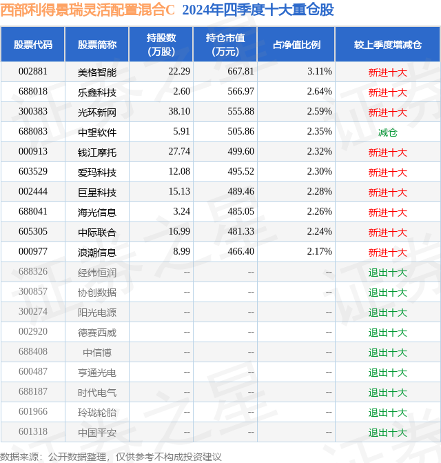 从基金规模来看,西部利得景瑞灵活配置混合C基金2024年四季度公布的基金规模为0.46亿元,较上一期规模6378.13万元变化了-1729.88万元,环比变化了-27.12%。该基金最新一期资产配置为:股票占净值比87.0%,无债券类资产,现金占净值比33.08%。从基金持仓来看,该基金当季前十大股票仓位达24.26%,第一大重仓股为美格智能(002881),持仓占比为3.11%。