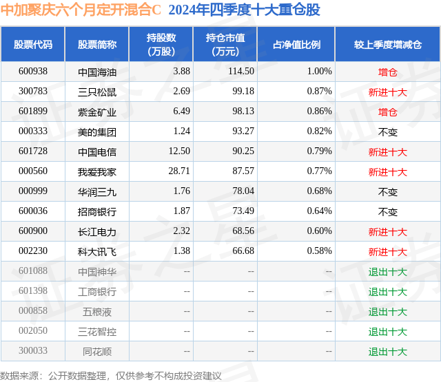 证券之星消息,日前中加聚庆六个月定开混合C基金公布四季报,2024年四季度最新规模0.54亿元,季度净值涨幅为0.19%。