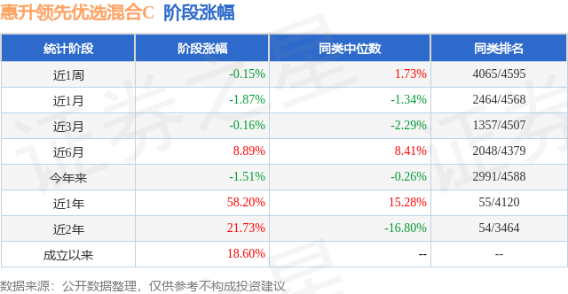 从业绩表现来看,惠升领先优选混合C基金过去一年净值涨幅为58.2%,在同类基金中排名55/4120,同类基金过去一年净值涨幅中位数为15.28%。而基金过去一年的最大回撤为-16.71%,成立以来的最大回撤为-36.19%。