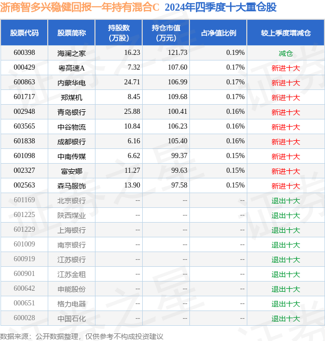 从基金规模来看,浙商智多兴稳健回报一年持有混合C基金2024年四季度公布的基金规模为2.31亿元,较上一期规模2.56亿元变化了-2444.69万元,环比变化了-9.55%。该基金最新一期资产配置为:股票占净值比12.35%,债券占净值比80.19%,现金占净值比1.01%。从基金持仓来看,该基金当季前十大股票仓位达1.63%,第一大重仓股为海澜之家(600398),持仓占比为0.19%。