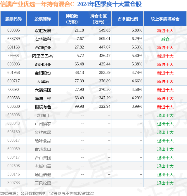 从基金规模来看,信澳产业优选一年持有混合C基金2024年四季度公布的基金规模为0.06亿元,较上一期规模536.68万元变化了26.04万元,环比变化了4.85%。该基金最新一期资产配置为:股票占净值比86.56%,无债券类资产,现金占净值比14.49%。从基金持仓来看,该基金当季前十大股票仓位达51.66%,第一大重仓股为双汇发展(000895),持仓占比为6.8%。