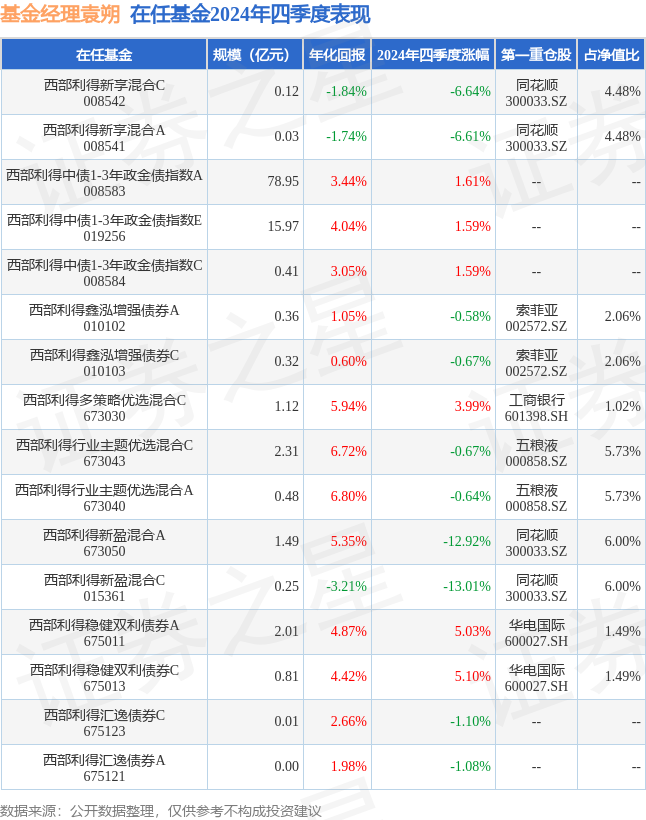 证券之星消息,日前西部利得新享混合A基金公布四季报,2024年四季度最新规模0.03亿元,季度净值涨幅为-6.61%。