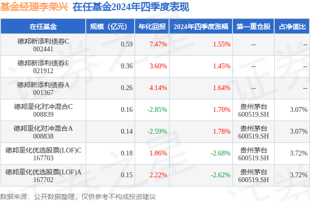 从基金规模来看,德邦量化对冲混合A基金2024年四季度公布的基金规模为0.14亿元,较上一期规模1424.6万元变化了-20.98万元,环比变化了-1.47%。该基金最新一期资产配置为:股票占净值比74.63%,债券占净值比1.01%,现金占净值比21.02%。从基金持仓来看,该基金当季前十大股票仓位达16.32%,第一大重仓股为贵州茅台(600519),持仓占比为3.07%。