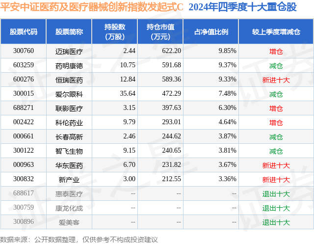 从基金规模来看,平安中证医药及医疗器械创新指数发起式C基金2024年四季度公布的基金规模为0.41亿元,较上一期规模4183.84万元变化了-117.39万元,环比变化了-2.81%。该基金最新一期资产配置为:股票占净值比93.15%,无债券类资产,现金占净值比8.34%。从基金持仓来看,该基金当季前十大股票仓位达61.68%,第一大重仓股为迈瑞医疗(300760),持仓占比为9.85%。