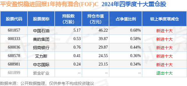 从基金规模来看,平安盈悦稳进回报1年持有混合(FOF)C基金2024年四季度公布的基金规模为0.17亿元,较上一期规模1760.38万元变化了-90.03万元,环比变化了-5.11%。该基金最新一期资产配置为:股票占净值比2.4%,无债券类资产,现金占净值比7.51%。从基金持仓来看,该基金当季前十大股票仓位达2.4%,第一大重仓股为中国石油(601857),持仓占比为0.68%。