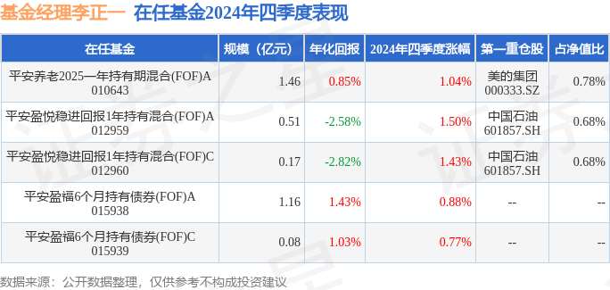 证券之星消息,日前平安盈悦稳进回报1年持有混合(FOF)C基金公布四季报,2024年四季度最新规模0.17亿元,季度净值涨幅为1.43%。