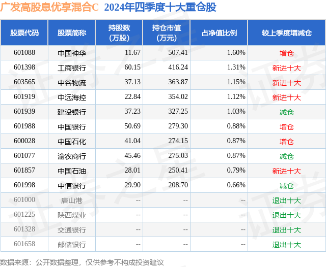 从基金规模来看,广发高股息优享混合C基金2024年四季度公布的基金规模为0.66亿元,较上一期规模6757.33万元变化了-186.74万元,环比变化了-2.76%。该基金最新一期资产配置为:股票占净值比93.39%,债券占净值比0.45%,现金占净值比6.52%。从基金持仓来看,该基金当季前十大股票仓位达10.28%,第一大重仓股为中国神华(601088),持仓占比为1.6%。