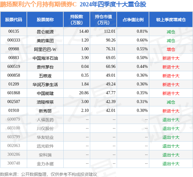 从基金规模来看,鹏扬聚利六个月持有期债券C基金2024年四季度公布的基金规模为0.66亿元,较上一期规模8915.53万元变化了-2280.96万元,环比变化了-25.58%。该基金最新一期资产配置为:股票占净值比7.7%,债券占净值比111.75%,现金占净值比9.0%。从基金持仓来看,该基金当季前十大股票仓位达4.64%,第一大重仓股为昆仑能源(00135),持仓占比为0.81%。