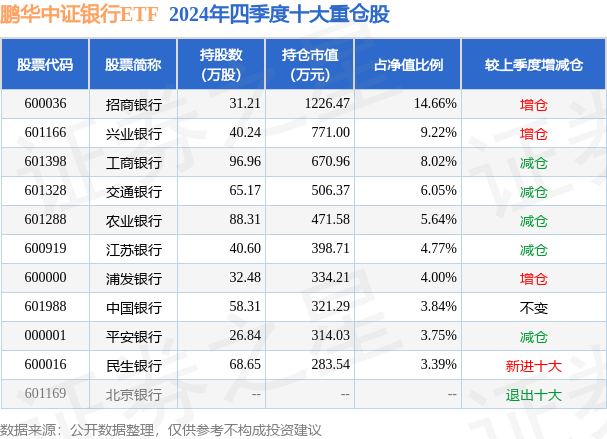 证券之星消息,日前鹏华中证银行ETF基金公布四季报,2024年四季度最新规模0.84亿元,季度净值涨幅为5.36%。
